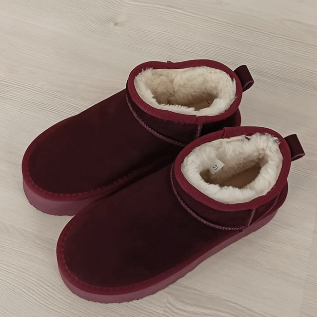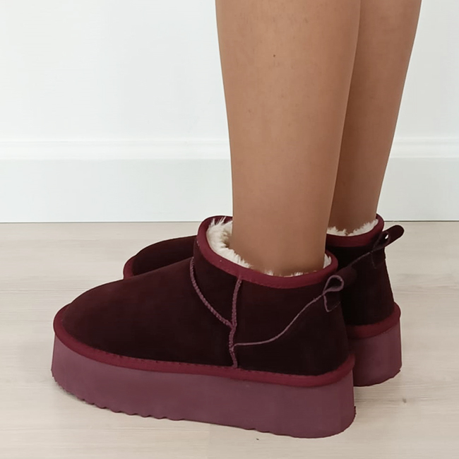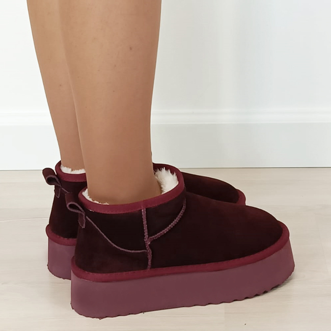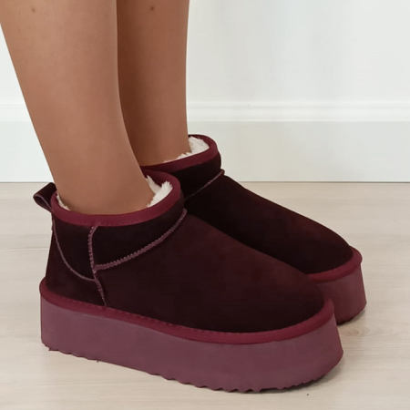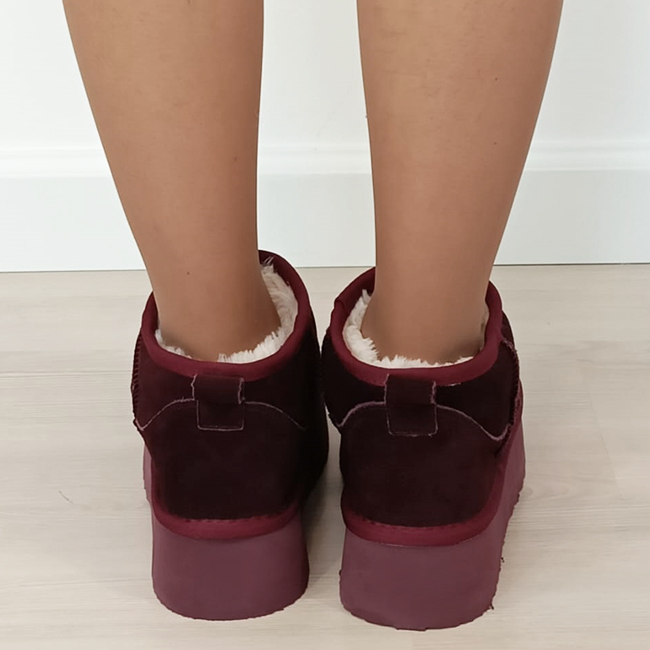 in interior sunt captusite cu blanita ecologica calduroasa INALTIMEA TOTALA - 13 cm INALTIME TALPA IN SPATE - 4.5 cm INALTIME TALPA IN FATA - 4 cm NUANTA - bordo STIL - casual