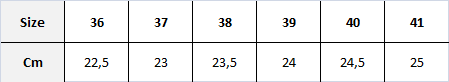 | Size | 36 | 37 | 38 | 39 | 40 | 41 |