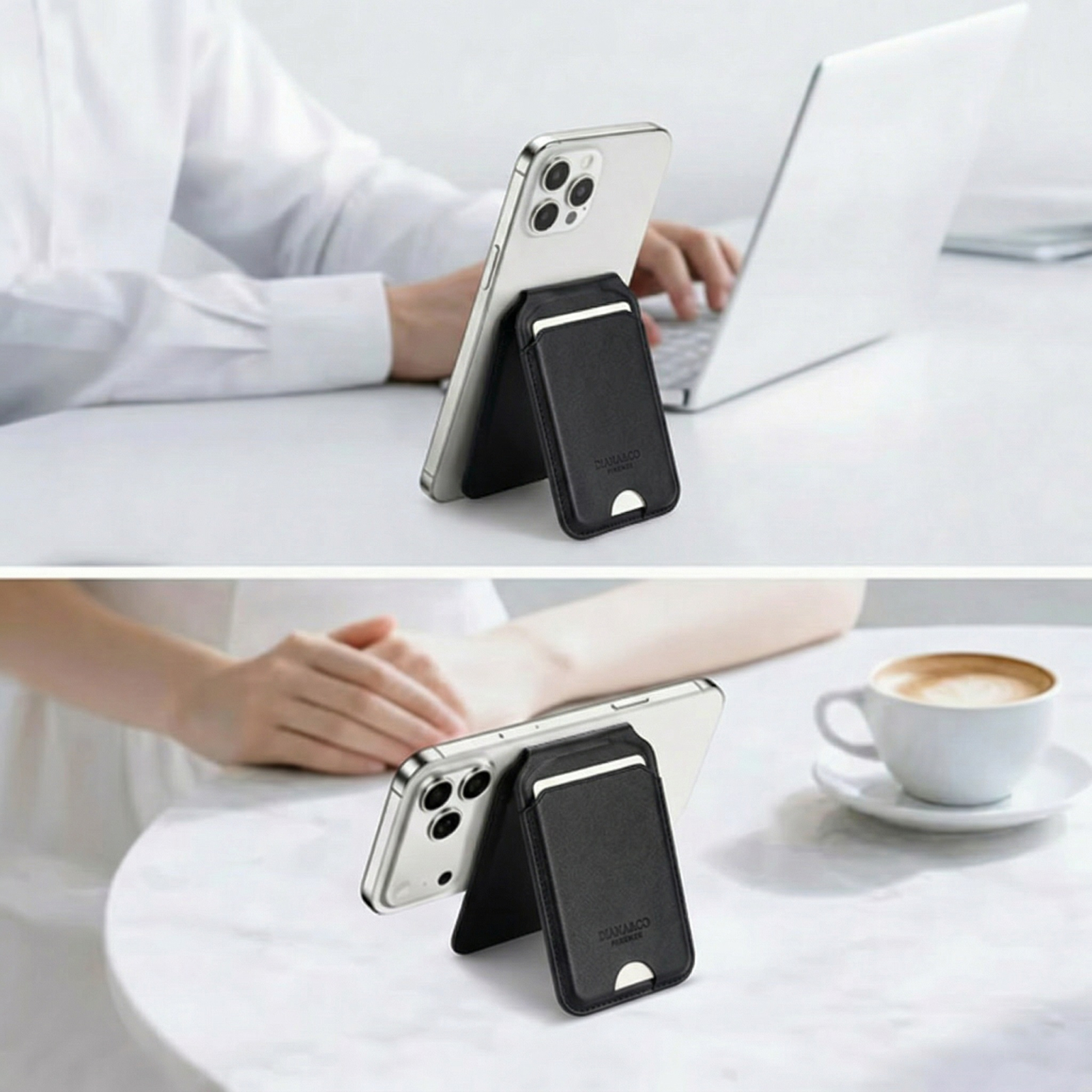 • Suport Ajustabil (Kickstand): Designul pliabil permite transformarea portofelului într-un suport stabil pentru telefon. Acesta poate fi reglat în diverse unghiuri  între 15° și 180°, oferind moduri de vizualizare atat portret, cat și peisaj pentru apeluri video sau vizionarea de continut.